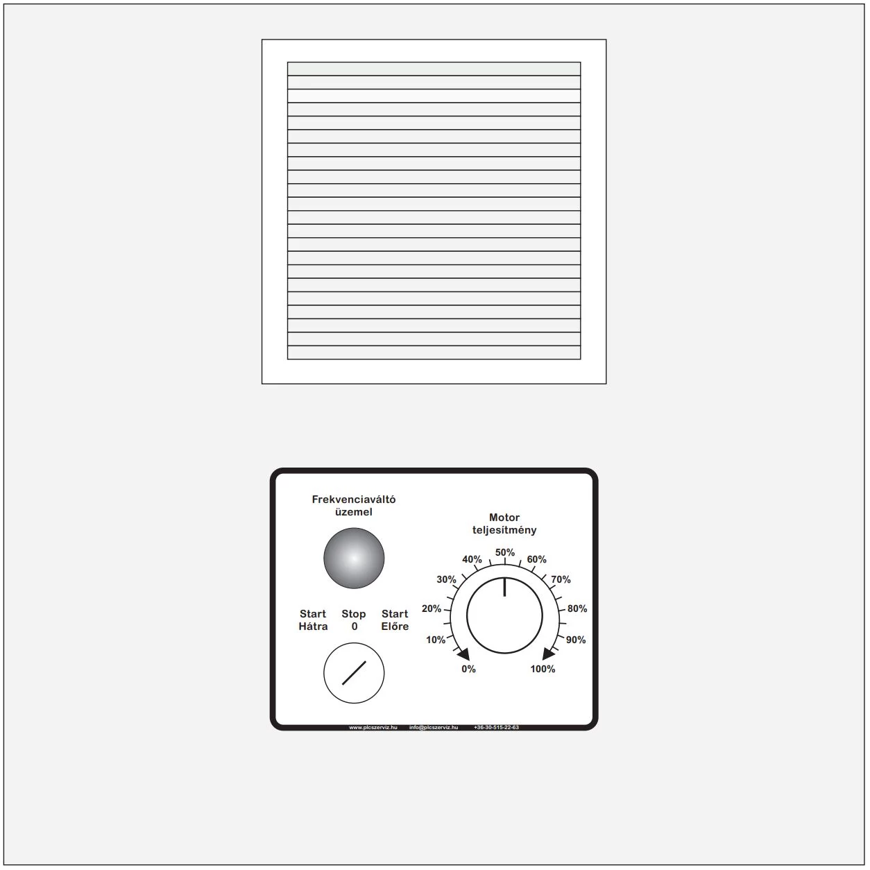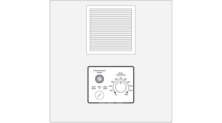 Frekvenciaváltó szakszerű beépítése fém kapcsoló szekrénybe építve előlapra szerelt kapcsolóval, visszajelző lámpával és potenciométerrel.